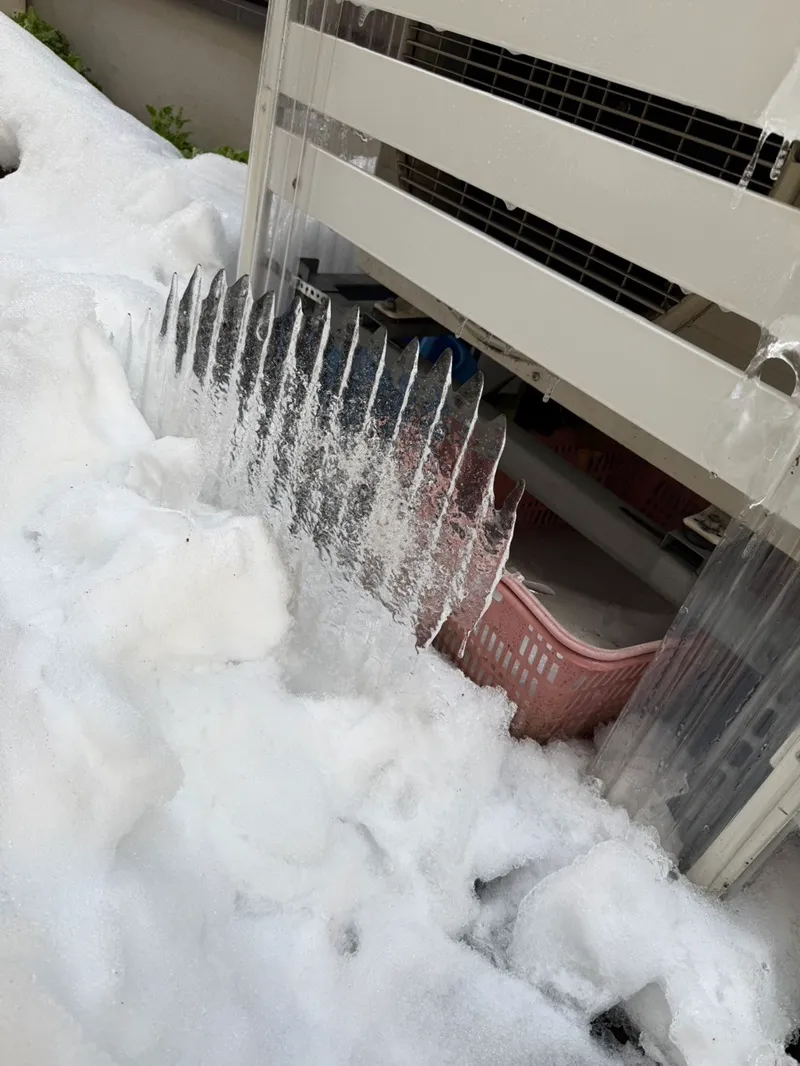 エアコン室外機の裏側(給気口)に付いた雪や氷をぬるま湯で溶かしてくださいとお伝えしました